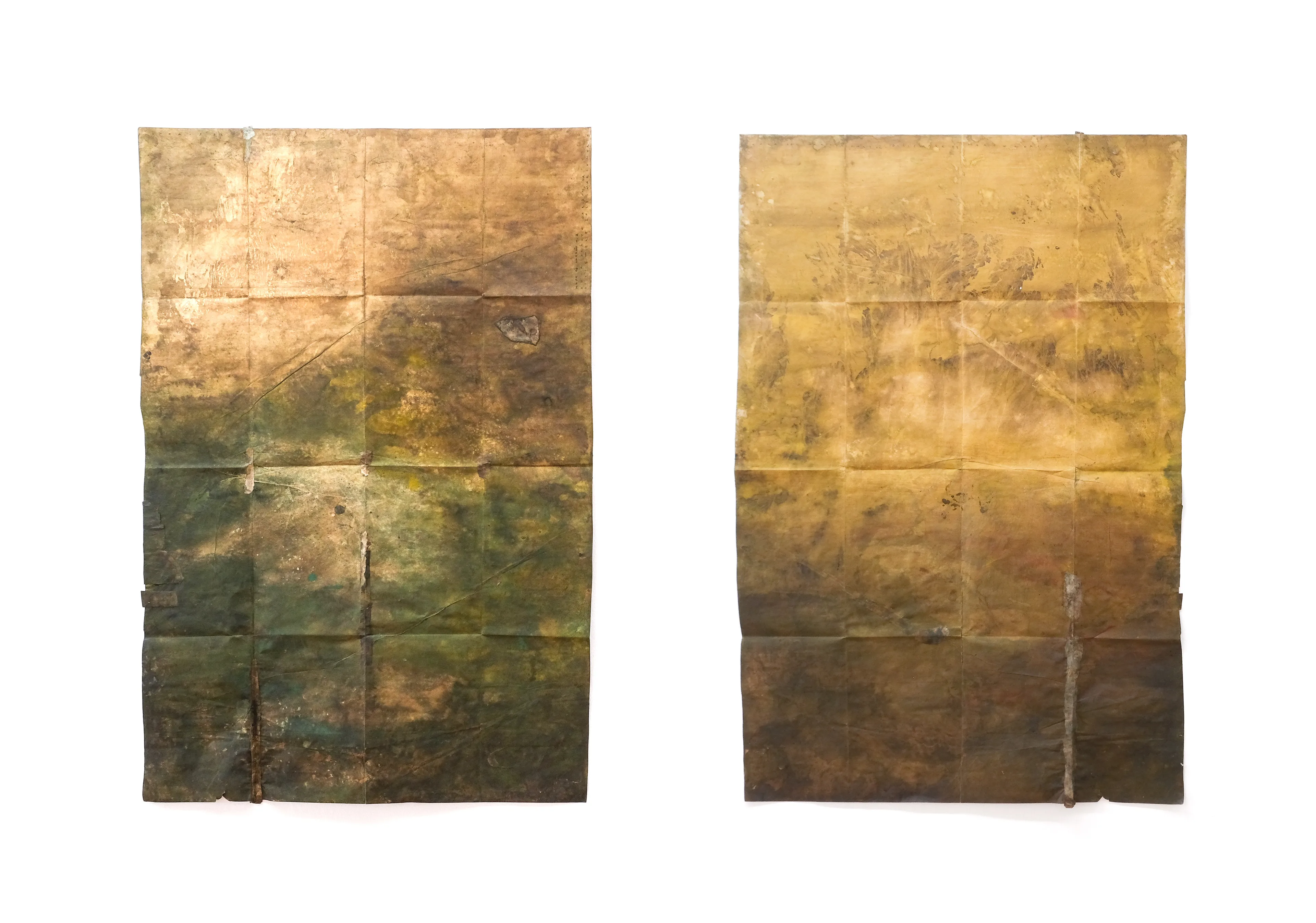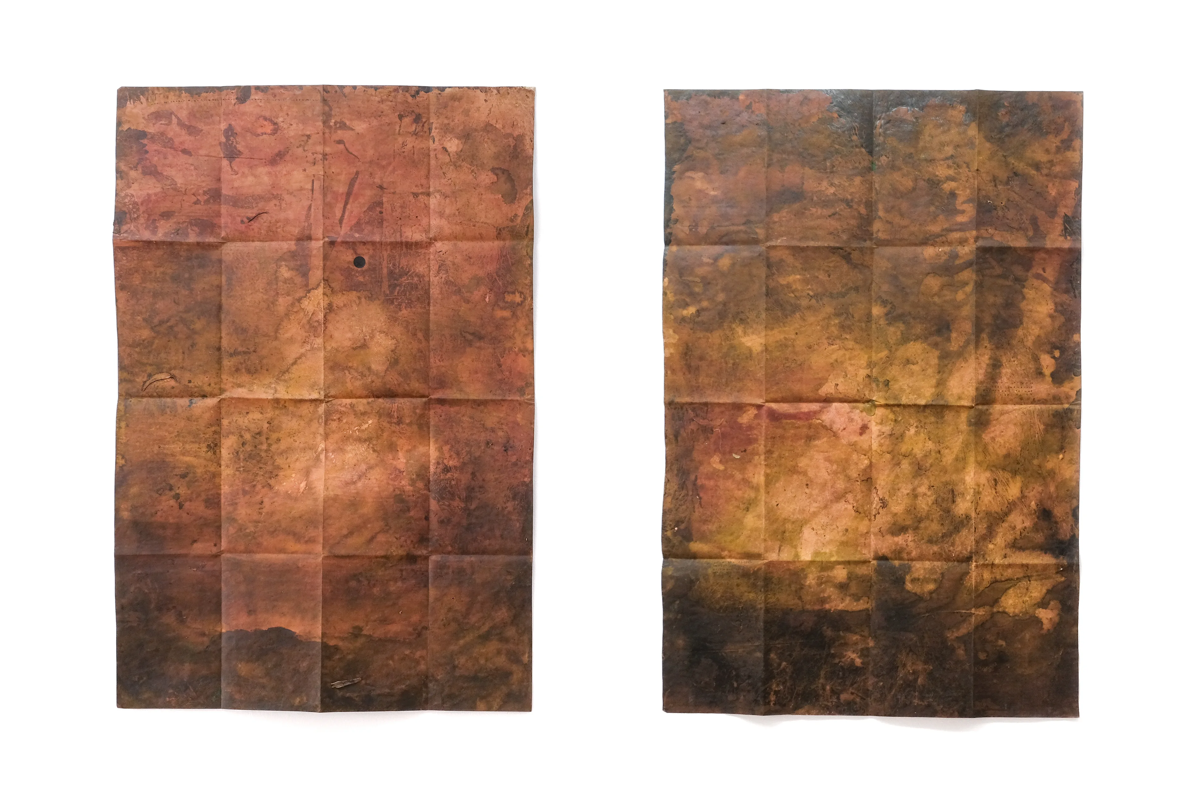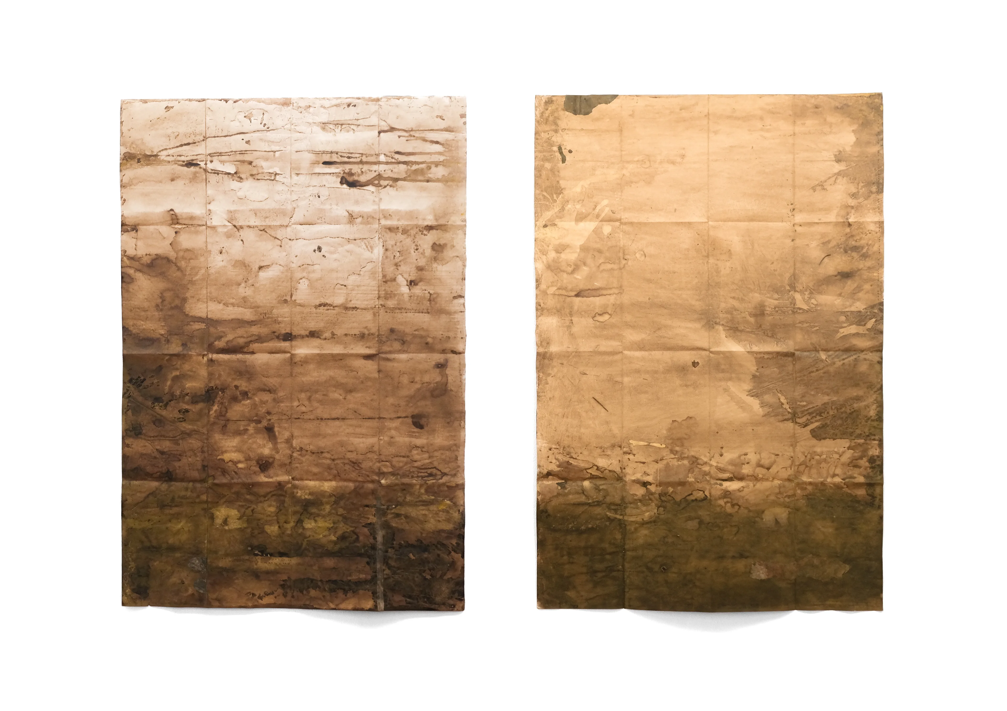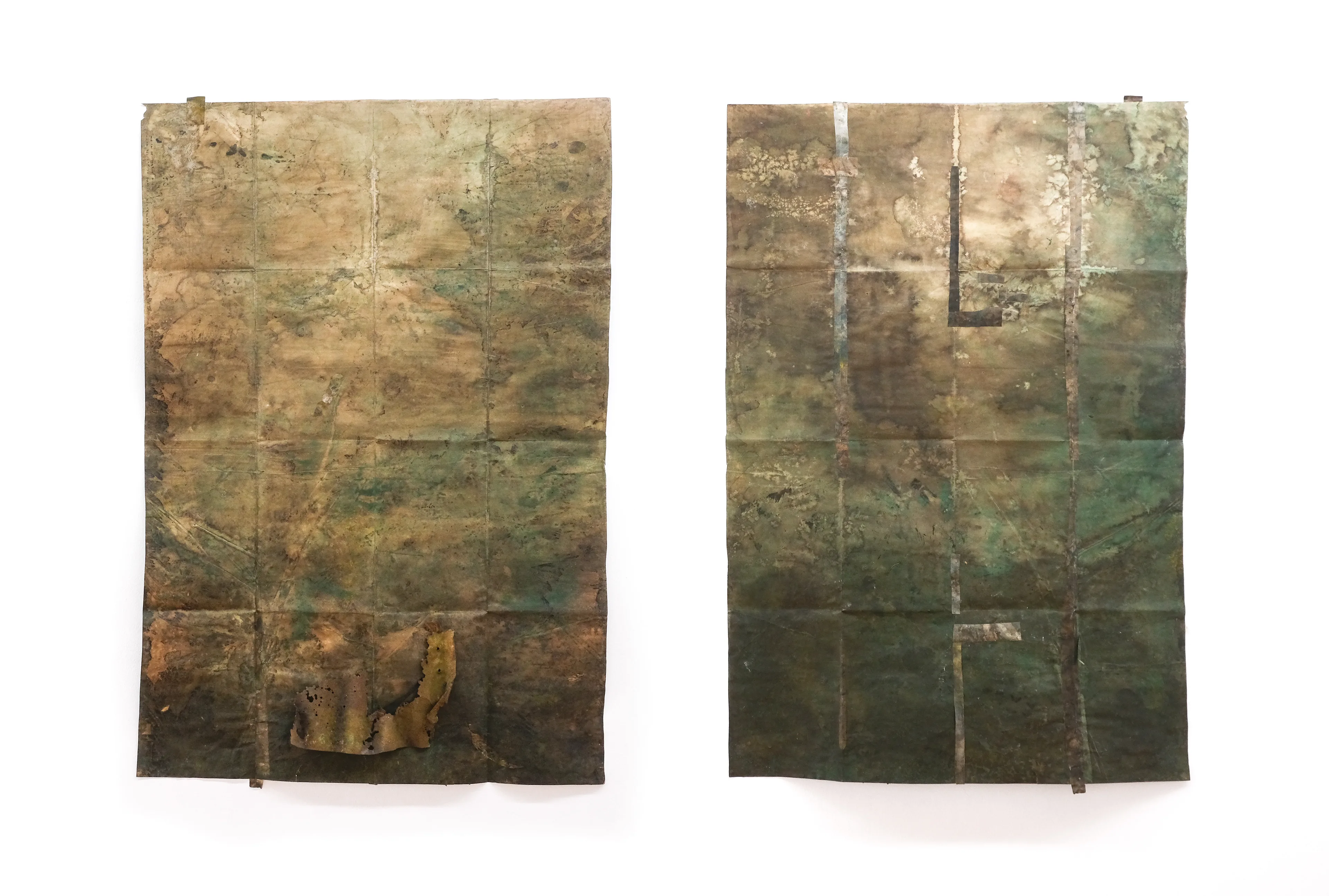 5 mapas doble cara. Técnica mixta, hierro oxidado, collage y agua del arroyo de Garzón sobre papel, 150 × 100 cm